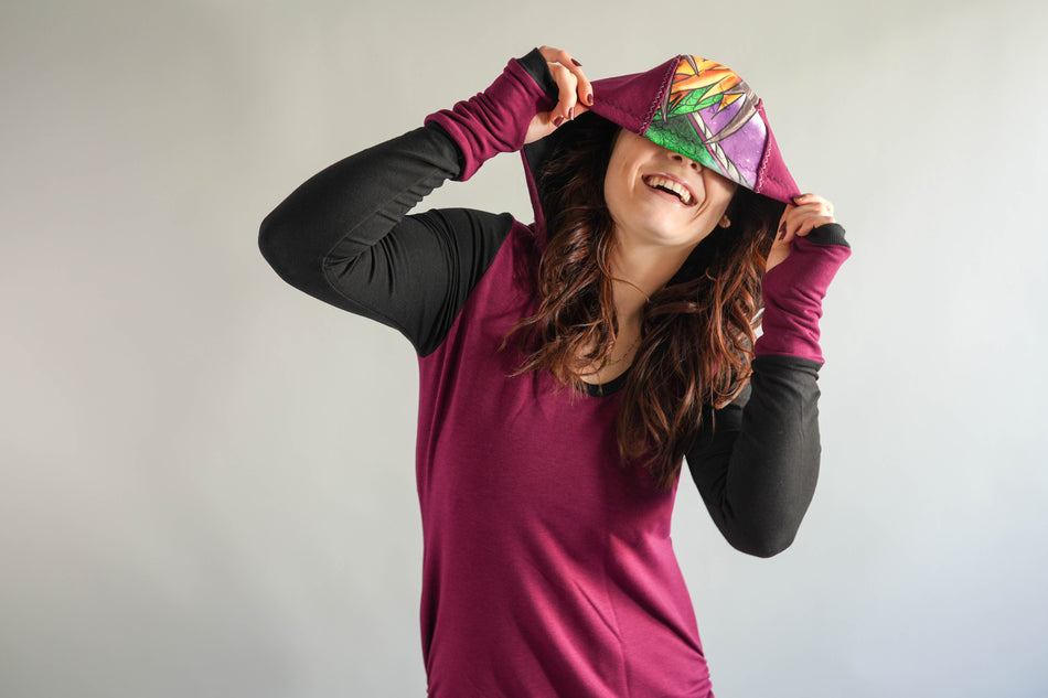 We get our photographs printed onto fabric, work with local artists, or use fabric we find that's pretty, unique, or weird to create beautiful wearable art.
