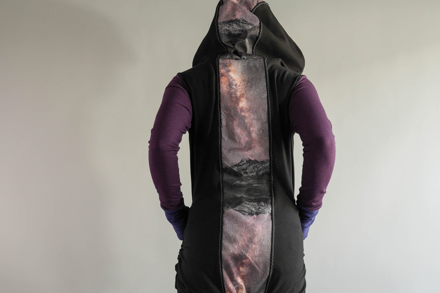 The Spirit Design has patch pockets, a circle skirt, and a beautiful art panel. Your design can be sleeveless with ribbing around the armhole or long sleeves and thumb holes. You can choose with a hood, a collar or a clean neckline,