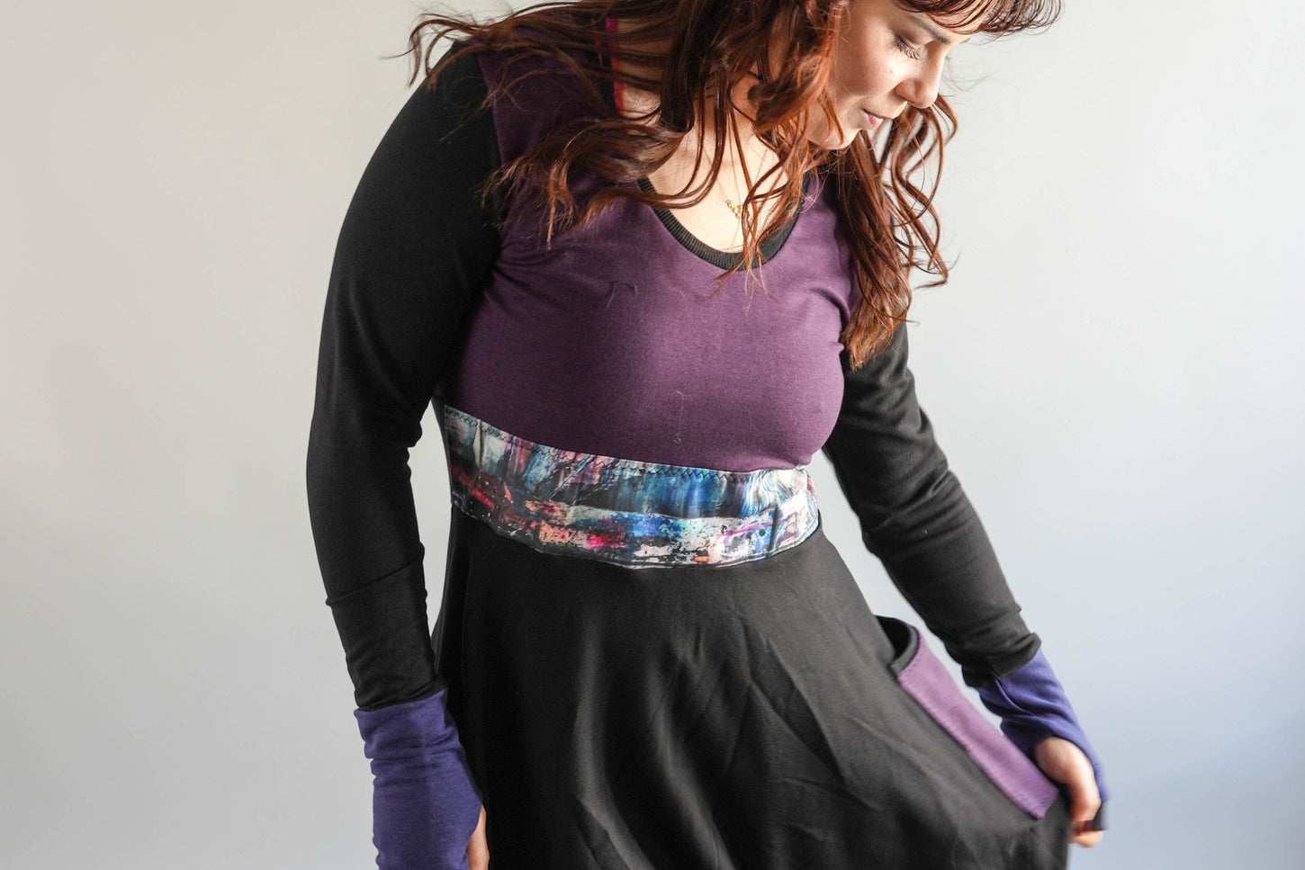 This style is from our Spirit Collection. This beautiful, fun style features big patch pockets, a circle skirt and a stunning piece of art at the front. This is the "Canopy Keeper" art piece by Ali Cat Arts, beautifully displayed...