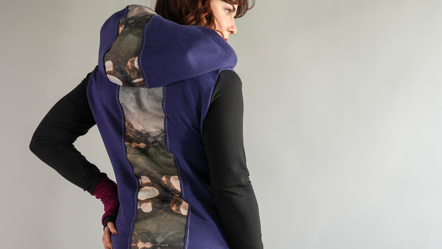 This is the Tank hoodie from our Ego Collection. This unique style features hidden side pockets, elegant side gathers, and a striking "Canopy Keeper" art piece by Ali Cat Arts, beautifully displayed down the back. Learn More about the Art...