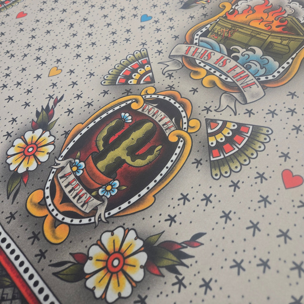 "I wanted to remind us all that in a world that is ever more divided, the most radical act is community and kindness—which translated for me into a common tattoo image of a “Don’t be a Prick” cactus. "